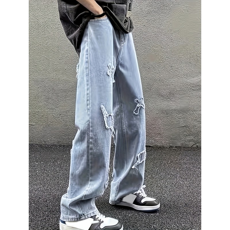 Embroidery Loose Ripped Cotton Blend Jeans, Men's Casual Street Style Distressed Denim Pants For Spring Summer