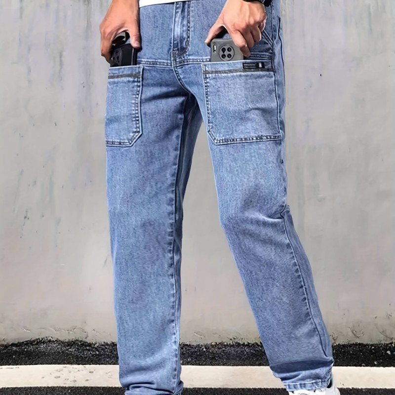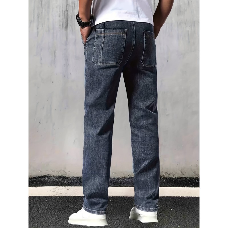 Loose Fit Straight Leg Jeans, Men's Casual Street Style Multi Pocket Denim Pants For All Seasons