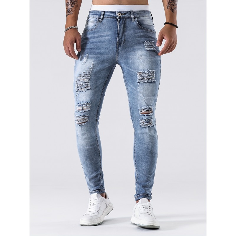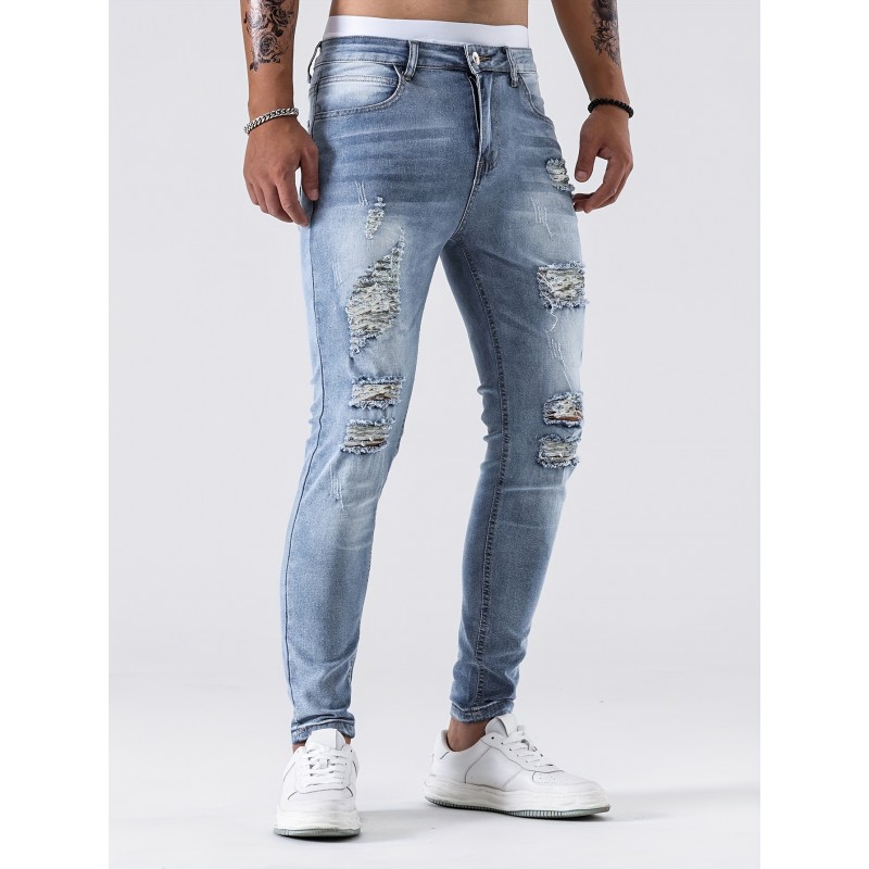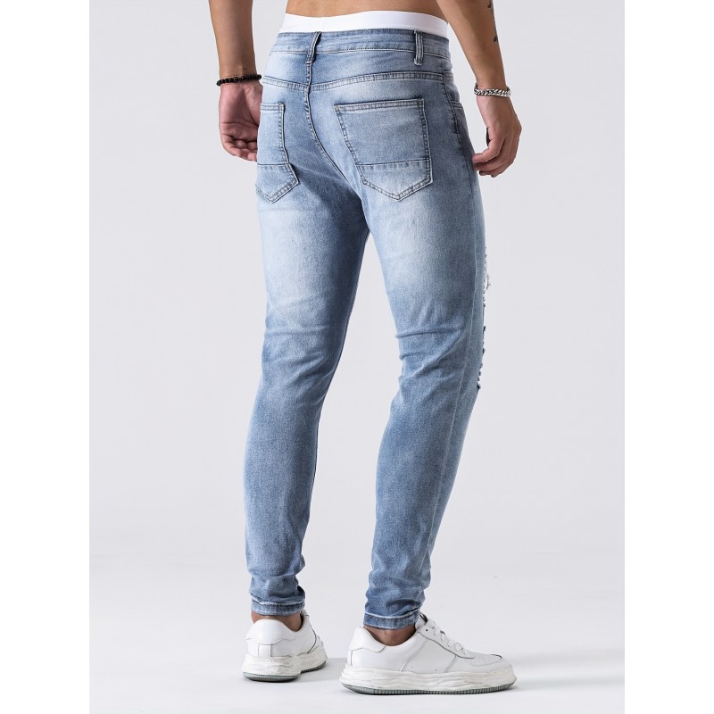 Slim Fit Ripped Jeans, Men's Casual Street Style Distressed Medium Stretch Denim Pants