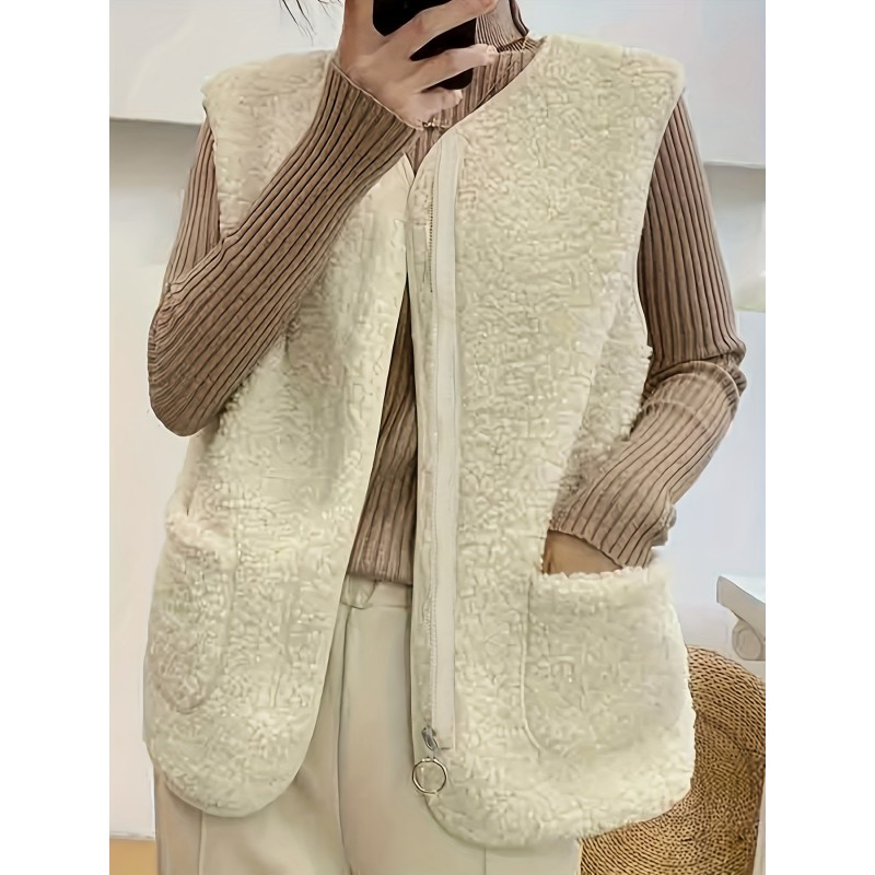 Solid Zipper Patched Pockets Teddy Vest, Versatile Sleeveless Warm Outwear For Fall & Winter, Women's Clothing